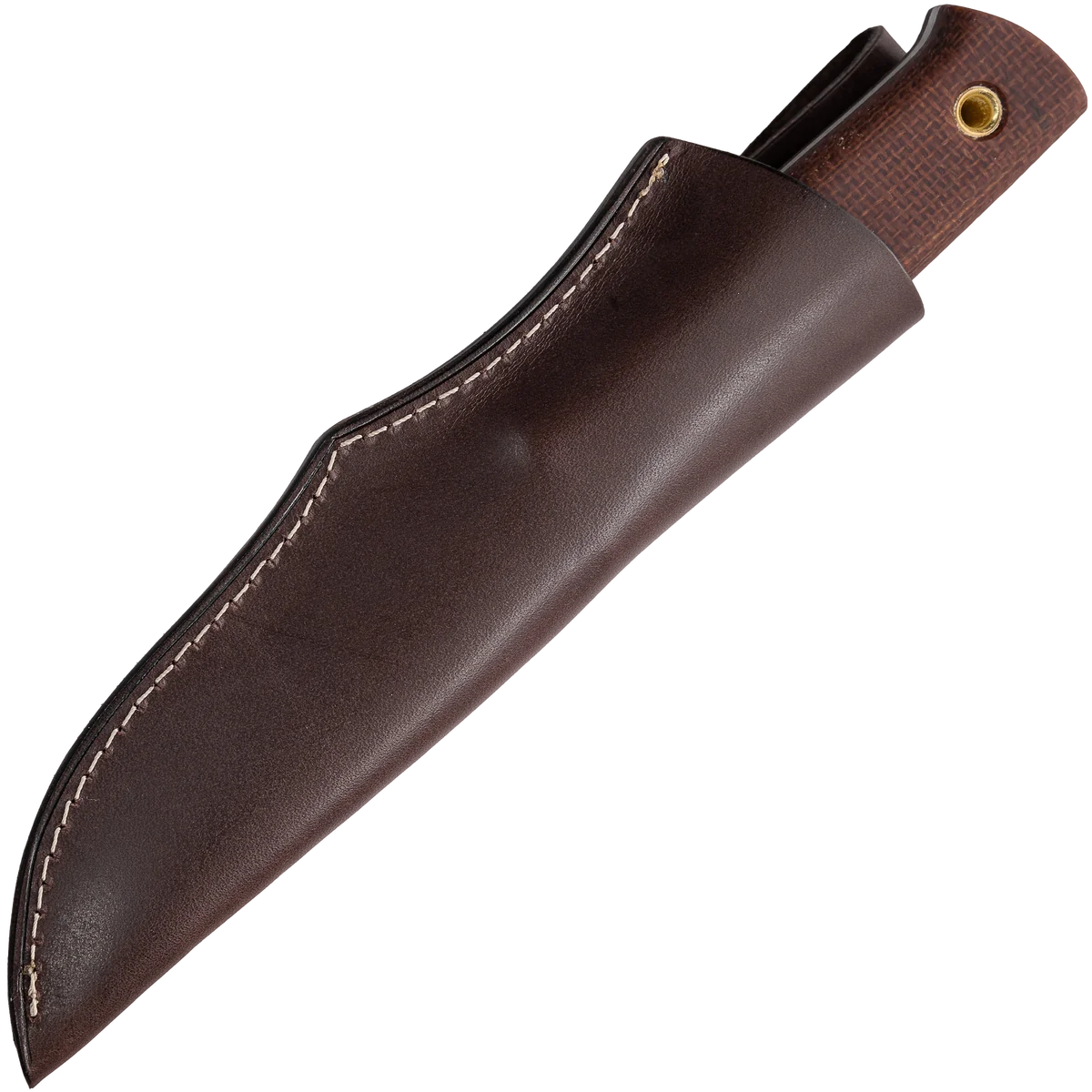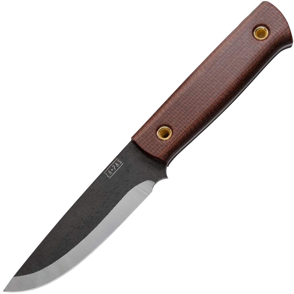 The Za-Pas BIWI is a knife that will provide you with excellent cutting properties and durability, regardless of the situation! It's a slim, lightweight fixed blade knife that will easily deal with light campsite chores, as well as heavier survival challenges in the field. The 4.29" blade is made of durable 3mm thick 4H13 steel, hardened to 58HRC, making it highly resistant to rust, very tough and easy to sharpen. The handle is constructed from water resistant brown jute micarta, and is fixed with brass grommets, through which a lanyard can be threaded. The knife comes with a sheath made of 3mm thick cowhide, with eye-catching contrasting stitching for a traditional look. For easier storage and transportation the sheath has an attached belt loop for vertical carry.