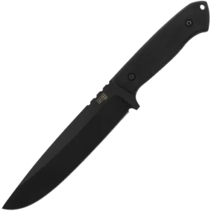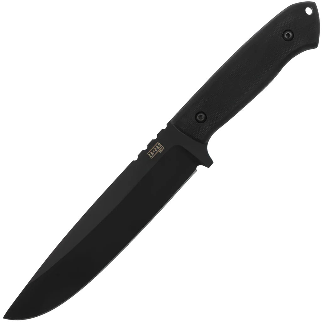 The "Expendable" survival knife from Za-Pas is the larger version of the Ultra Outdoor model. It's a knife built for the outdoors and makes light work of the cutting tasks thrown its way – perfect for hiking, camping, survival and bushcraft enthusiasts. It can be used for trimming branches, cutting ropes or other materials, peeling and cutting food, and performing precision work. It features a full tang carbon steel NMV construction blade. The 6.42" blade is hardened at 58-59 HRC, offering a good compromise between toughness and sharpness. The blade is finished with CERAKOTE ceramic paint, this treatment gives the knife a sleek appearance but also cuts off the oxygen supply to the steel – at the same time making it resistant to weather conditions. The handle is made from black G10, which is then shaped and sandblasted for optimal grip, even in wet conditions. G10 is a popular material favoured for its resistance to impact, water and warping, as well as being comfortable in the hand. The knife comes with a kydex sheath with nylon belt loop for safe transportation on a belt or equipment.