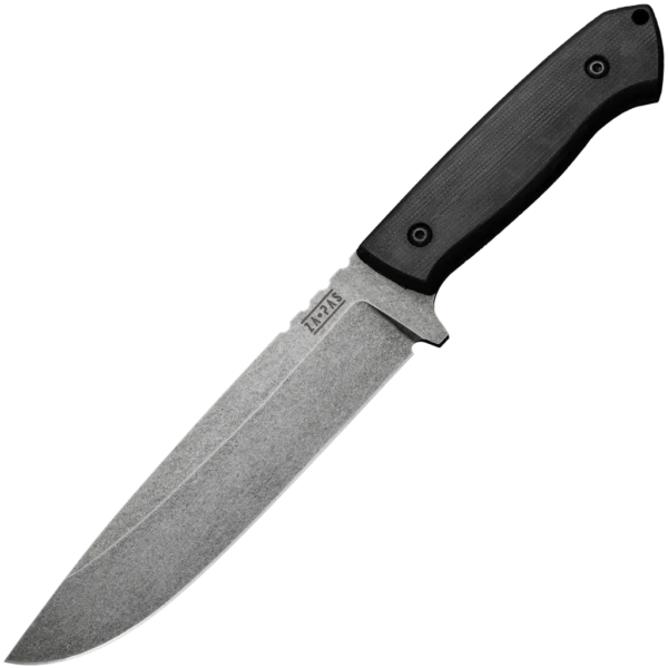 The "Expendable" survival knife from Za-Pas is the larger version of the Ultra Outdoor model. It's a knife built for the outdoors and makes light work of the cutting tasks thrown its way – perfect for hiking, camping, survival and bushcraft enthusiasts. It can be used for trimming branches, cutting ropes or other materials, peeling and cutting food, and performing precision work. It features a full tang carbon steel NMV construction blade, and is finished with an Acid Stonewash, ideal for people who use their knives for more demanding tasks. The 6.42" blade is hardened at 58-59 HRC, offering a good compromise between toughness and sharpness. The handle is made from black G10, which is then shaped and sandblasted for optimal grip and resistance, even in wet conditions. The knife comes with a kydex sheath with nylon belt loop for safe transportation on a belt or backpack.
