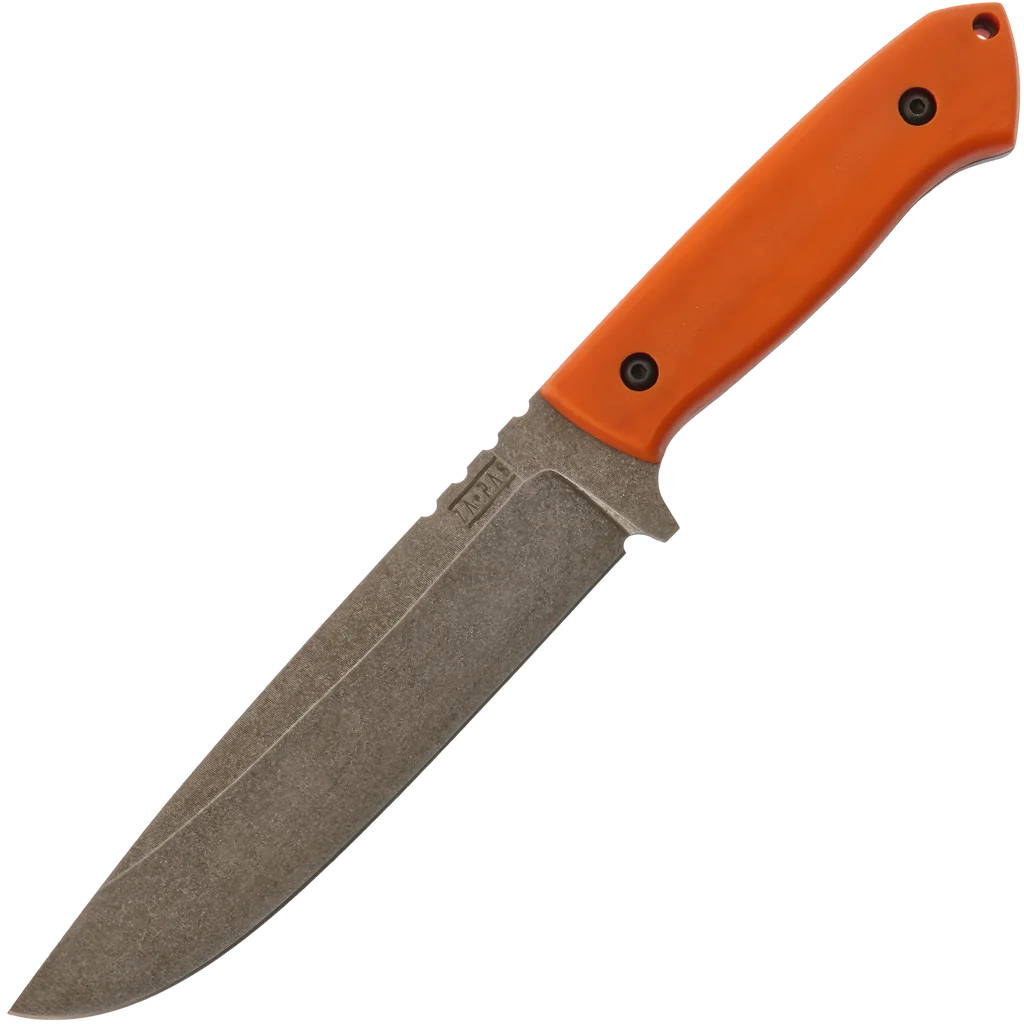 The "Expendable" survival knife from Za-Pas is the larger version of the Ultra Outdoor model. It's a knife built for the outdoors and makes light work of the cutting tasks thrown its way – perfect for hiking, camping, survival and bushcraft enthusiasts. It can be used for trimming branches, cutting ropes or other materials, peeling and cutting food, and performing precision work. It features a full tang carbon steel NMV construction blade, and is finished with an Acid Stonewash, ideal for people who use their knives for more demanding tasks. The 6.42" blade is hardened at 58-59 HRC, offering a good compromise between toughness and sharpness. The handle is made from orange G10, which is then shaped and sandblasted for optimal grip and resistance, even in wet conditions. The knife comes with a kydex sheath with nylon belt loop for safe transportation on a belt or backpack.