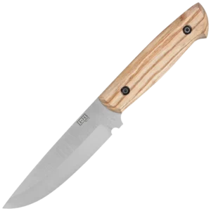 The Explorer is a versatile classic style knife by Polish knife creators ZA-PAS. It is aimed at outdoor enthusiasts of all types, hikers, hunters, bushcrafters and more will find a solid companion in this knife. Due to its dimensions and light weight , it is incredibly handy and easy to carry, without losing the features of a full-size bushcraft knife. The full tang knife is constructed from high-quality 80CrV2 (NCV1) carbon steel with a hardness of 59-60 HRC, and completed with a satin finish on its 4.72" blade. 80CrV2 (NCV1) is a low-alloy tool steel suitable for knives of various sizes. Very resistant to cracking, making it suitable for both larger knives and smaller, harder working knives such bushcraft knives. The handle is made from an eye-catching ash wood and screwed directly to the blade with contrasting black screws. The Explorer is supplied with a hand-made black cow-hide sheath.