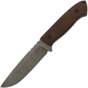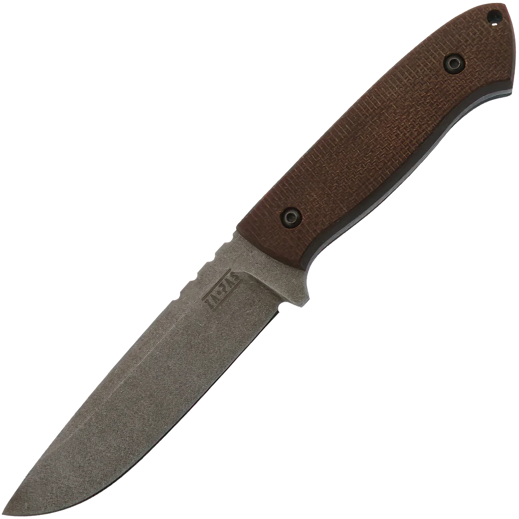 Za-Pas present the Ultra Outdoor, a modern and reliable knife with a total length of 9.69", a blade with an impressive length of 5", a thickness of 4.4 mm and high-quality NMV steel construction. The blades 58-59 HRC hardening guarantees exceptional durability and long-term use. The Ultra Outdoor is finished with an acid stonewash -ideal for people who use their knives for more demanding tasks, imperfections that occur over time blend with the rugged finish making them practical for daily use without the need for constant maintenance. Not only is the blade impressive – the 4.69" ergonomic handle is made of durable and abrasion-resistant brown micarta, ensuring a comfortable and secure grip. The knife is equipped with a solid Kydex sheath, which not only perfectly protects the blade, but also allows you to quickly and easily remove the knife. Whether you are an outdoor enthusiast, camper or bushcrafter, this knife is the perfect companion for your adventure!