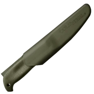 A design collaboration between Andrew Demko and Lynn C. Thompson, the Cold Steel Finn Hawk is the latest in our series of inexpensive hard wearing bushcraft and outdoor tools. Its traditional Nordic styled “Scandi Ground” German 4116 steel blade is sub-zero cryo-quenched for superior edge holding potential, with a steep 7.5mm blade bevel and a functional curving belly for skinning and slicing strokes. Furthermore, its 4” blade is more than big enough for most game processing tasks, not to mention for camp chores and food prep too. The Finn Hawk’s handle is two time injection molded. The first layer of high-impact polypropylene is strong, durable and highly weather resistant, while the outer layer (made of TPR rubber) has a whorled spiral pattern providing a food safe, comfortable and secure grip in even the worst conditions. The Finn Hawk is supplied complete with a slim line secure-ex polymer sheath with integrated belt loop.