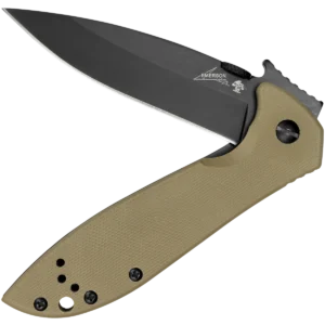 Kershaw Knives and Emerson Knives have joined forces on a series of knives that combine the precision engineering of Kershaw with Emerson's uncompromising functional design. The CQC-4K features a drop-point blade for multi-purpose cutting capability. Black-oxide coating protects the blade and makes it non-reflective, too. A textured G-10 front scale in coyote brown offers a secure grip. The handle back is stainless steel with black-oxide coating. For a safe and solid blade lock up, the CQC-4K has a frame lock. The CQC-4K is a manual opener using either the thumb disk or the patented Emerson "wave shaped feature." This opening feature enables the knife to be opened as it is removed from the pocket. By the time the knife has been fully withdrawn from the pocket, the blade is deployed and ready for use. A small wave-shaped tab on the top of the blade is built to catch on the pocket seam, opening the knife as it comes out of the pocket. This instant-open feature is a favorite among military, rescue, and law enforcement knife users. The pocketclip is reversible for left- or right-handed carry.