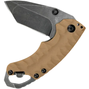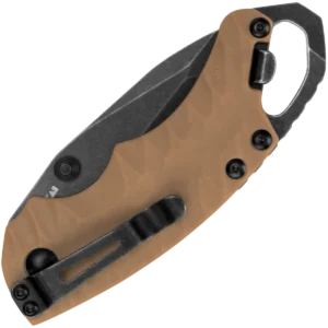 - Folding blade made from 8Cr13MoV stainless steel with a blackwash finish in a drop point style. Tan GFN handles with built in bottle opener, reversible pocket clip and lanyard hole. Uses a liner lock mechanism.